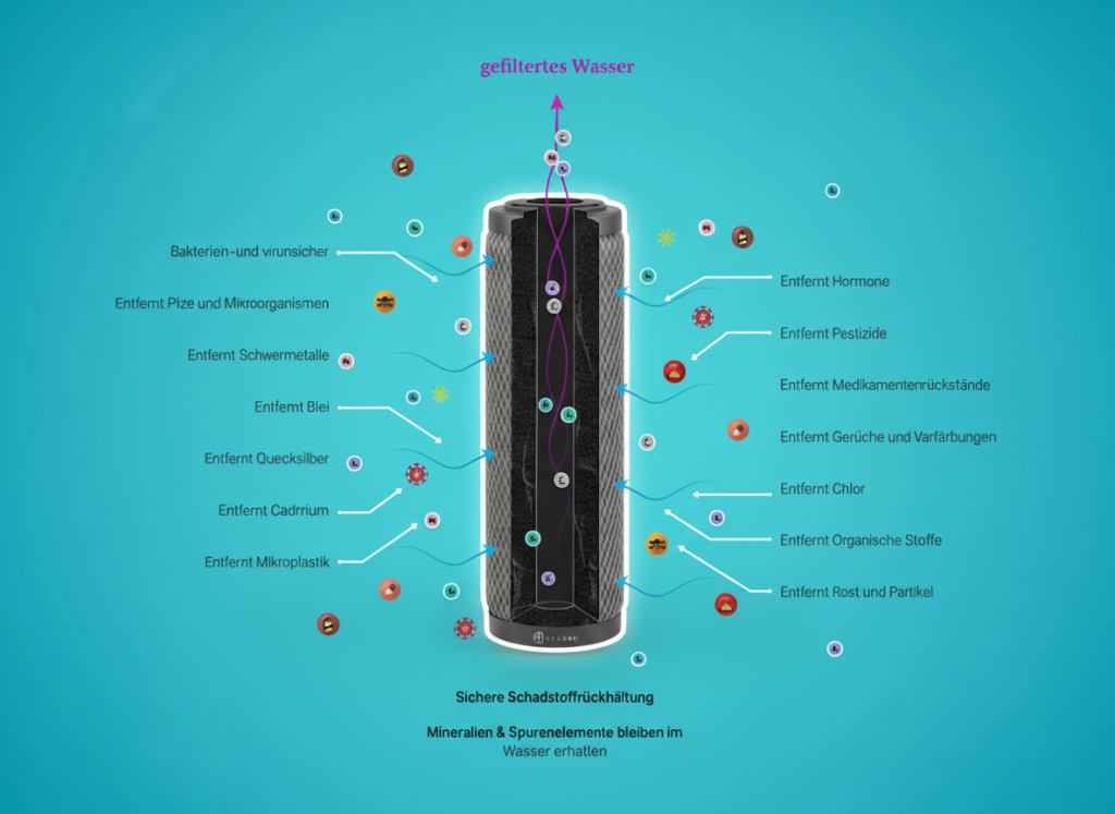 Der integrierte Aktivkohleblockfilter entfernt zuverlässig Schadstoffe wie Hormone, Medikamentenreste, Pestizide, Chlor, Mikroplastik, Schwermetalle, Pilze, Bakterien und organische Verbindungen. Gleichzeitig bleiben natürliche Mineralien und Spurenelemente im Wasser erhalten – für einen runden Geschmack und physiologisch wertvolles Trinkwasser.